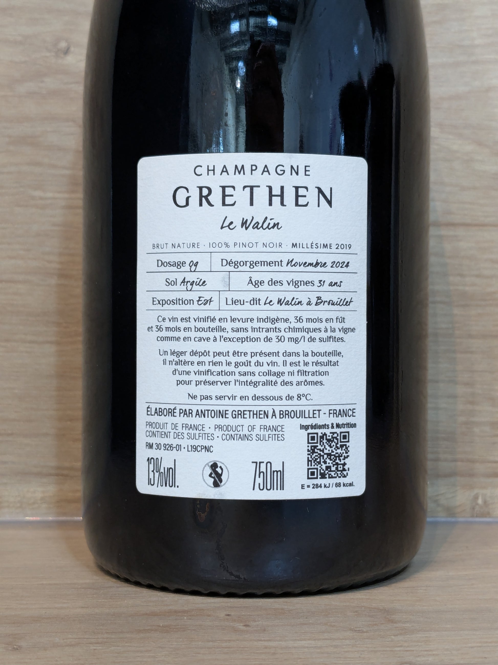 This Champagne is a single-vineyard cuvée, "Le Walin," from Domaine Grethen , a Blanc de Noirs (implicitly referring to Pinot Noir) produced in Brouillet , Marne. It is a 2019 vintage and a Brut Nature (with no added dosage, as indicated by the Dosage 0g ). It comes from 31-year-old vines facing east on clay soil. Vinification is carried out using indigenous yeasts without chemical additives, with aging for 36 months in oak barrels and 36 months in bottles , and a minimal addition of sulfites (maximum 30 mg/l ) to preserve the aromas.